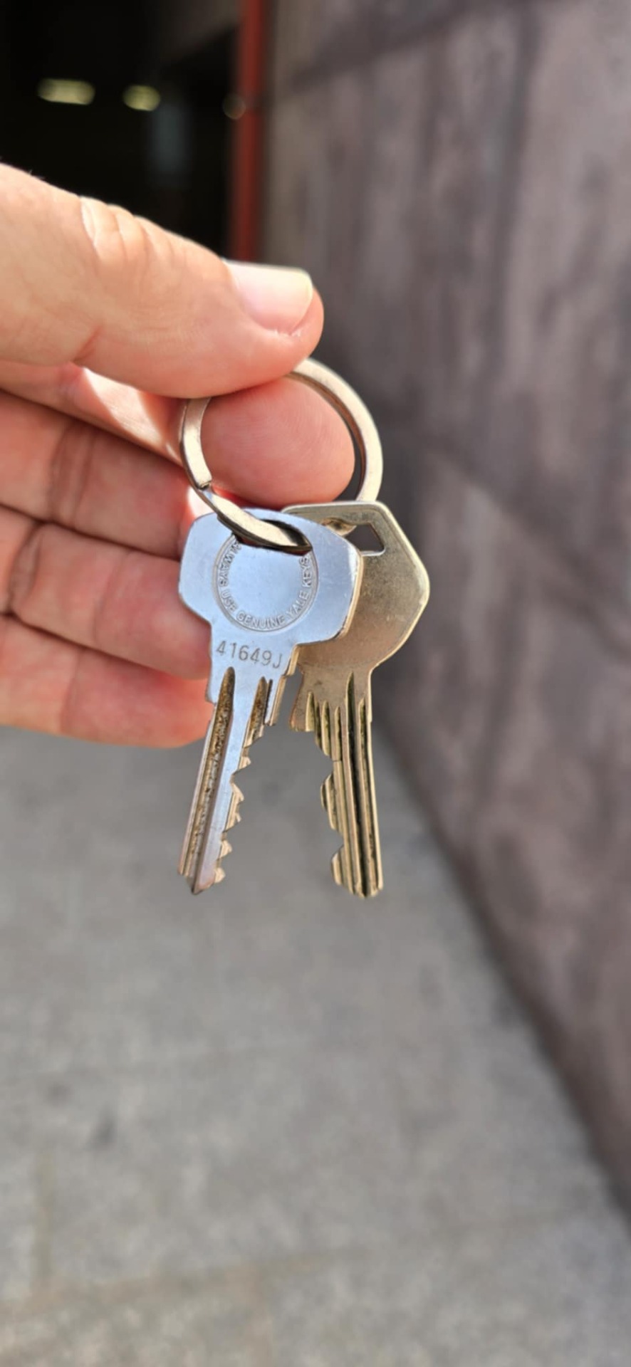 Az épület közelében találtunk szabad parkolót, egyetlen kulcsot kaptunk: egy a közösségi bejáratokat nyitja (kapu, lépcsőházak ajtai és medencepark), egy pedig a bejárati ajtót.