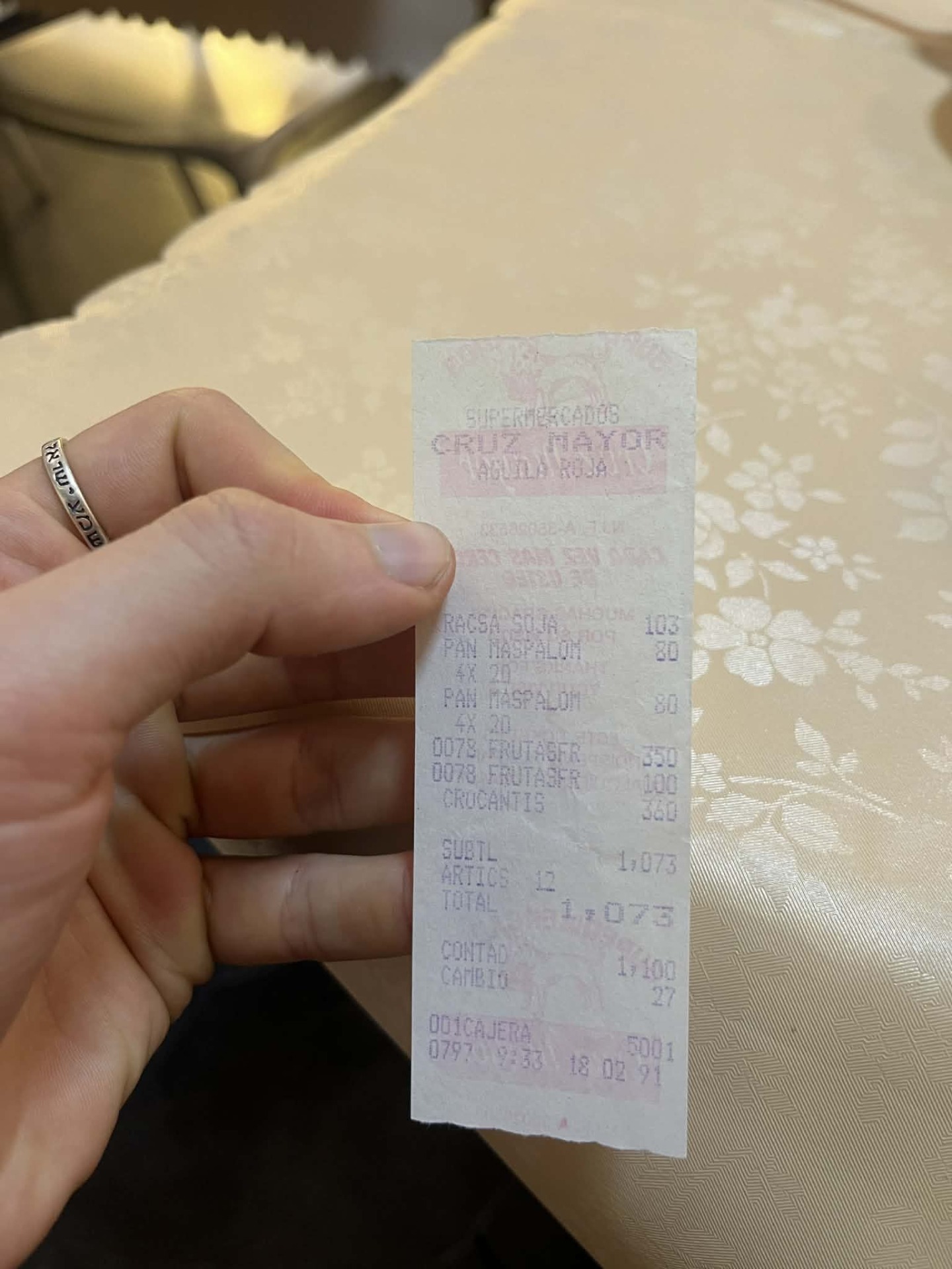 A blokkon látható információk szerint Attila az Aguila Roja (Vörös Sas) szupermarketben vásárolt 8 db kis kenyeret (Magyarországon inkább zsemlének hívjuk), kétféle gyümölcsöt, egy csomag szóját és egy csomag "rágcsát", mindösszesen 1073 pesetáért